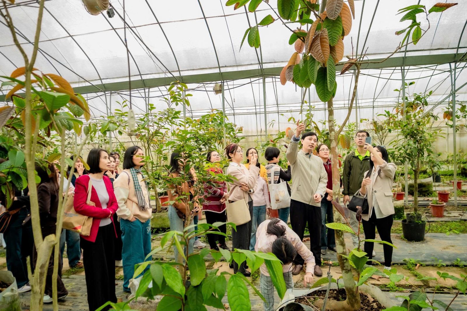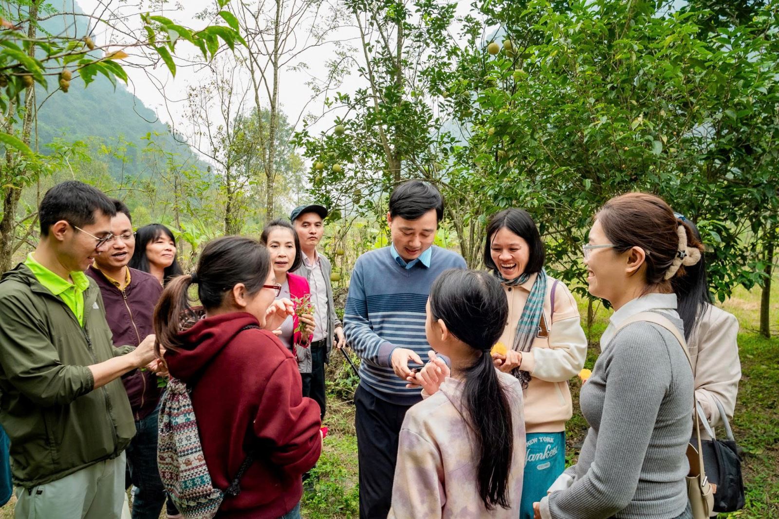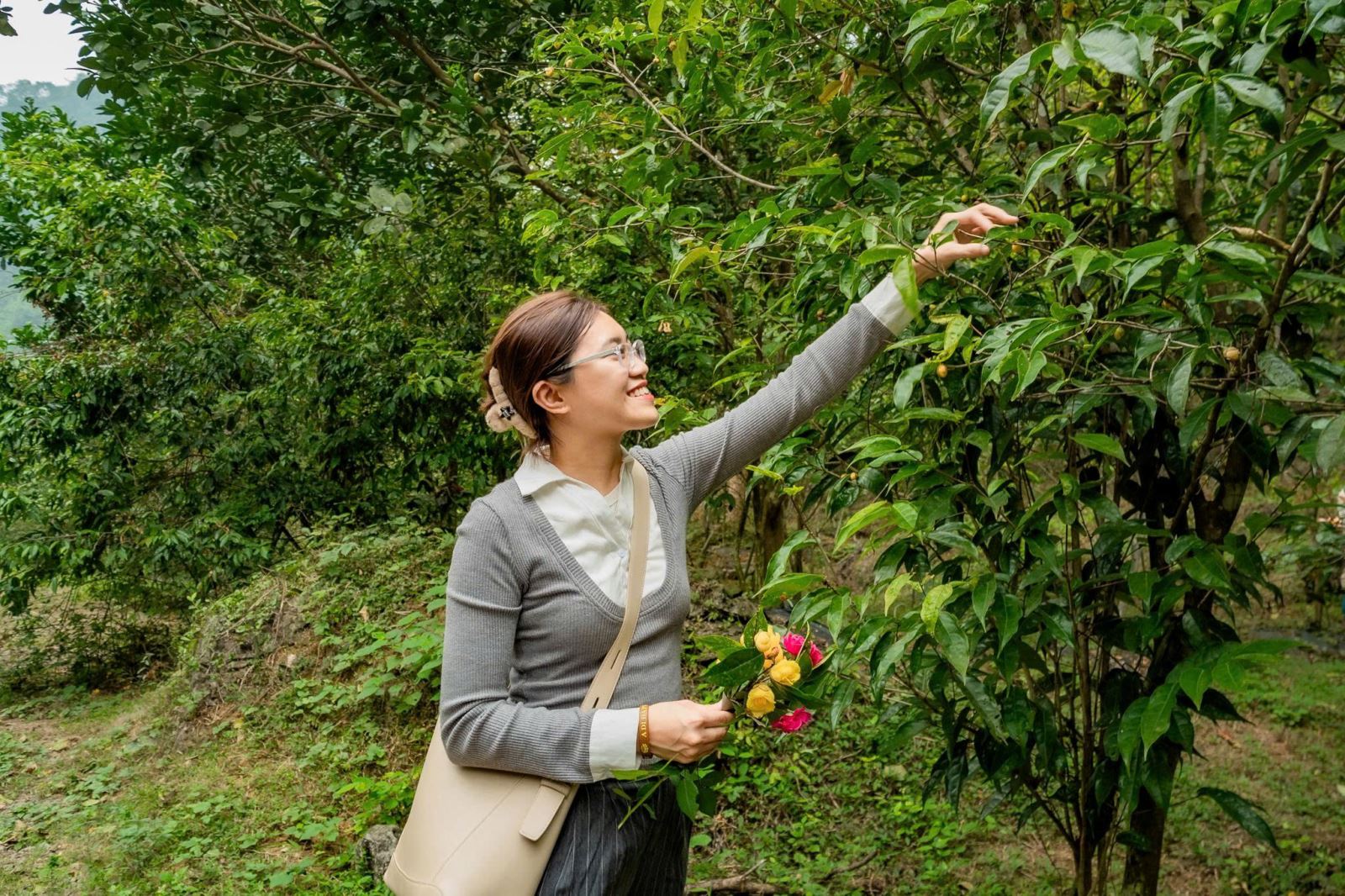 Trực tiếp đi bộ thăm khu trồng Trà hoa vàng đưỡ xen canh dưới bưởi, trồng hoa hồng, dưới tán là giảo cổ lam, nuôi cua đá, đi nhặt hoa rơi dưới gốc cây, hái & ăn trực tiếp trà hoa vàng hay những bông hồng,...